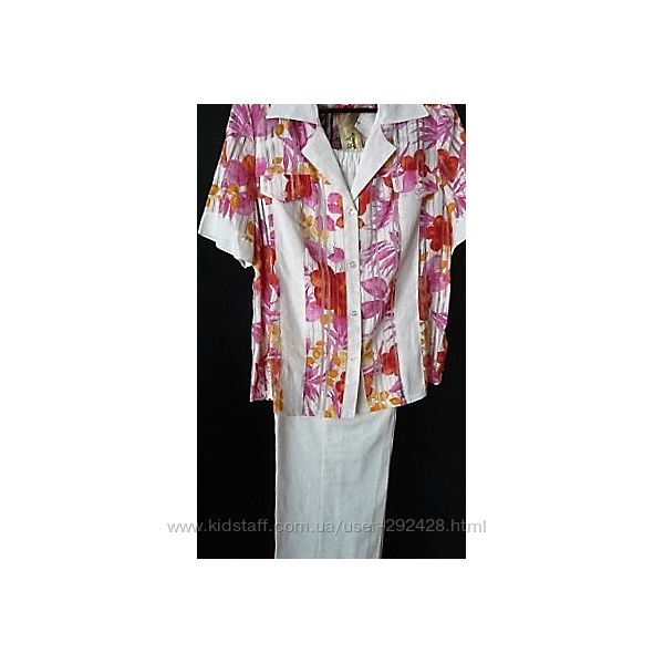 Жакет от летнего брючного костюма пр-ва Беларусь выполнен из качественной вискозной белой ткани комбинированной с цветной органзой, практичный и комфортный в использовании. Выкройка и качество пошива безупречные. РАСПРОДАЖА!!!Основные размеры:
