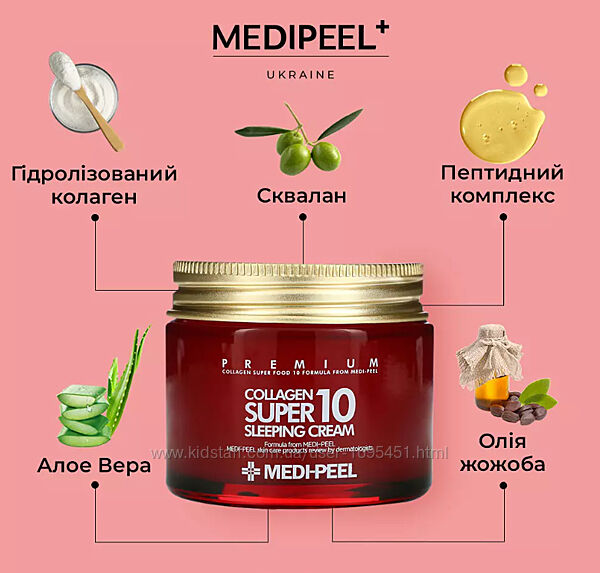 Омолоджувальний нічний крем для обличчя з колагеном MEDIPEEL+ Collagen Super10 Sleeping Cream відновлює пружність і еластичність шкіри, зміцнює тургор, підтягує і формує овал обличчя.Крем вирізняється високою концентрацією колагену (10,000ppm), який здатний заповнити шкірні заломи, зменшити глибину зморшок, а також стимулює вироблення власних еластинових і колагенових волокон. Комплекс з екстрактів 10 суперфудів інтенсивно зволожує, підвищує імунітет шкіри, має високу антиоксидантну активність і активно живить шкіру.