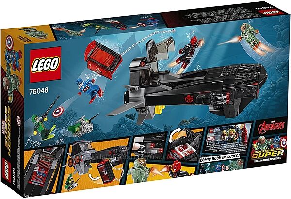 Конструктор LEGO Super Heroes 76048 Похищение Капитана Америка Капитан Америка был похищен приспешниками Гидры и посажен в специальную энергетическую ловушку, прикреплённую к подводной лодке Железного Черепа. Чтобы освободить супергероя из заточения, Железный человек поспешил в свою лабораторию и создал новую броню, способную выдерживать давление воды даже на максимальной глубине. Теперь он готов сразиться со злодеями и разрушить их боевую субмарину.