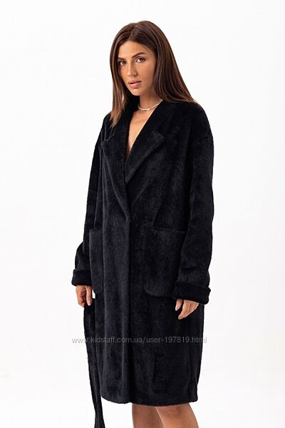 Пальто имеет удобную длину – ниже колена. Изделие застегивается кнопками. Предусмотрены шлевки под пояс. С повязанным на талии поясом пальто имеет утонченный вид.
