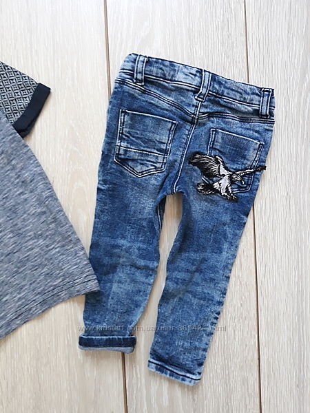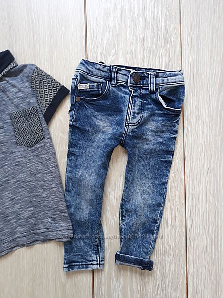 Джинсы River Island на 12-18 мес Застёгиваются на кнопочку, есть утяжка. Состав 99% хлопок и 1% эластан. Состояние идеальное