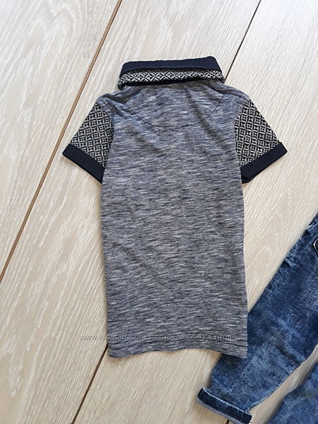 Стилёвое поло-футболка George на 12-18 мес Впереди застёгивается на пуговички. Состав 100% хлопок. Состояние очень хорошее.Замеры: длина по спинке 37,5 см, ширина между подмышками 25 см, плечи 21 см