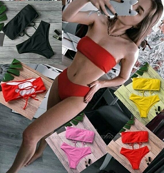 Новое поступление: купальники бандо с завязками 2 вида трусики бразилиана и трусики бикини высота трусиков 24 см. Бюстгальтер с поролоновыми вкладышами, сзади на завязках. расцветки: черный, красный, желтый, розовый.S:: Подходит на чашку лифа А/В/С, бедер 82-90 см