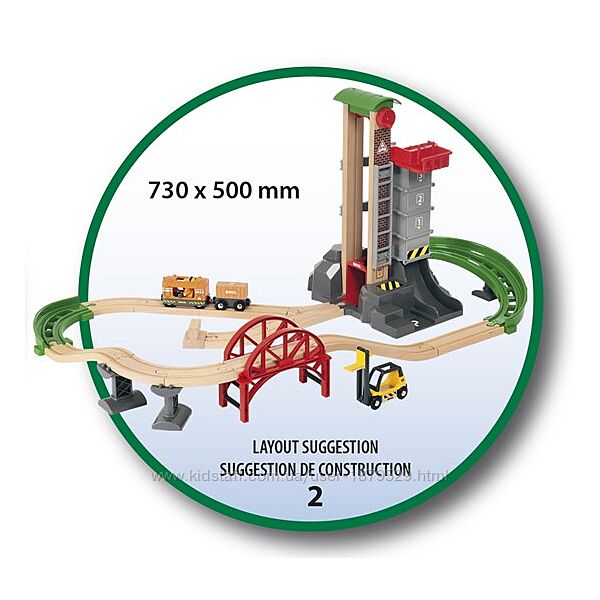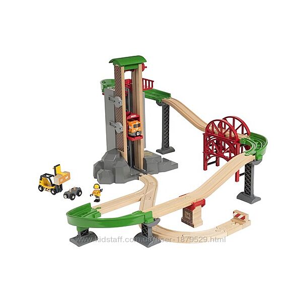 Набір дерев´яної залізниці Бріо 33887 Логістична станція складається з елементів для будівництва великого центру навантаження-розвантаження вантажних вагонів та машин Brio. За допомогою високого ліфта (висота 370 мм) машинки та вагони можуть підніматисяна різні поверхи логістичної станції та розвантажуватись на них. Вантажі