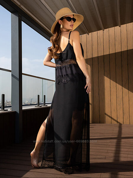 Чорна шифонова сукня в білизняному стилі з мереживом і нижньою укороченою підкладкою із софту. Модель максі довжини з прямим кроєм, тонкими бретельками, що регулюються, і декольте. Плаття із глибокими бічними розрізами.Розмірний ряд: S, M, L, XL