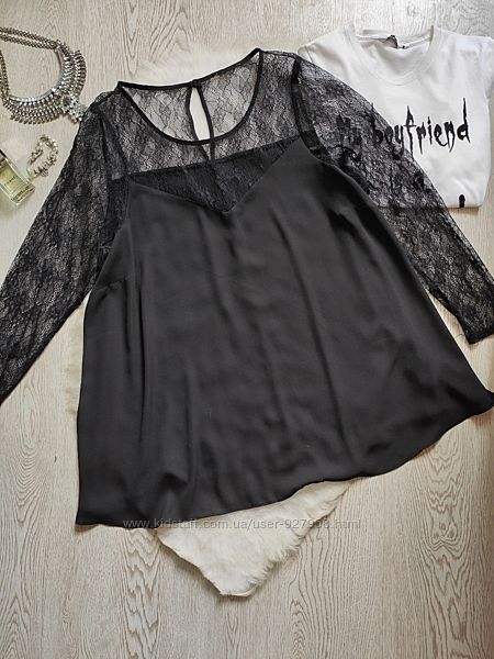 Новая черная длинная блуза туника шифон с ажурным верхом декольте гипюр вышивка длинный рукав от New Look размер "22\ХХХХЛ" ПОГ 60-64 ПОТ 77-81 ПОБ 88-91 Длина 78 см Рукав 62 Бицепс 21-27 Плечи 41-50 Состояние новой вещи,черный легкий креп шифон,не просвещает,по верху плотненький гипюр вышивка и открытое секси декольте,гипюр тянется,шифон нет,цена 899 грн