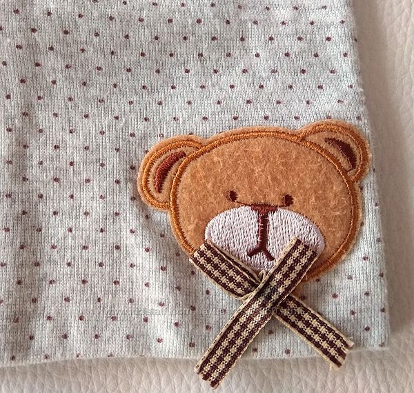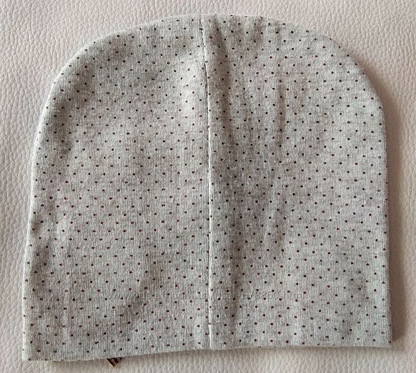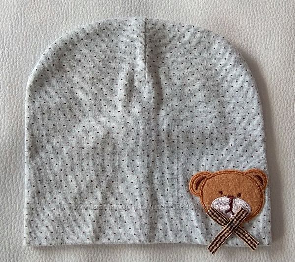 Сіра трикотажна шапка в цятку і аплікацію ведмедика для дівчинки.Підійде на голову 47-48. Орієтуйтеся на заміри.