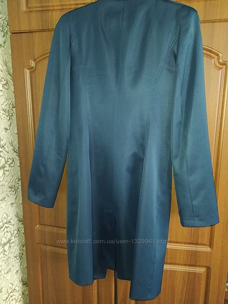 Плащ насиченого синього кольору з підкладкою, в гарному стані, є дефект : ззаду на рівні шліци є смужка від праски , не дуже помітна. 44 розмір, довжина90 см, плечі35 см, ПОГ 43-44 см. Застібається на гудзики, є кишені. В комплекті іде пояс-трансформер із баскою, яка знімається. Фото не передає колір , насичений синій .Без повернення.