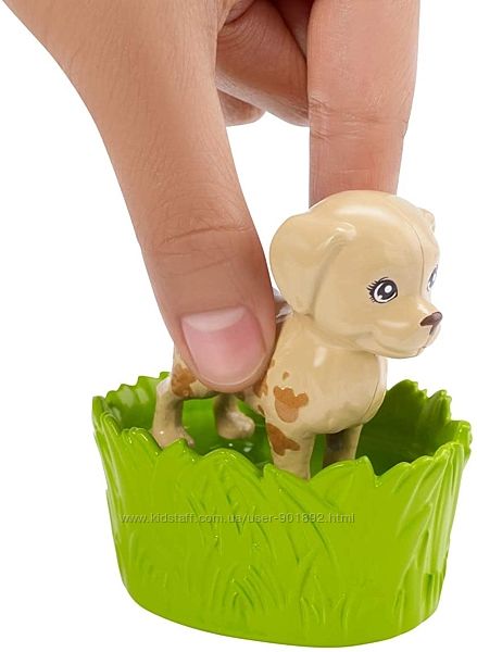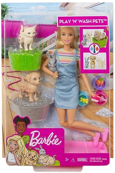 Кукла Барби любит всех животных, особенно щенков, котят и кроликов. Каждый игровой набор " Играй и Купай " включает по одному из питомцев, которых кукла Барби может кормить, купать и обнимать. Каждый питомец меняет цвет , что делает игру более интересной. Маленьким любителям животных будет очень весело ухаживать с куклой Барби за ее тремя очаровательными питомцами, которые так сильно любят играть в лужах и пачкаться.