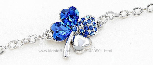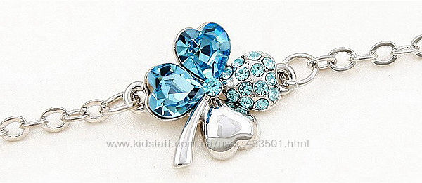 Женский браслет с четырёхлистным клевером, на удачу. Листочки выполнены в форме сердечек. Листочки клевера, богато украшены сверкающими кристаллами Материал: Ювелирный сплав.Длинна браслета: 15 см + 4,5 см