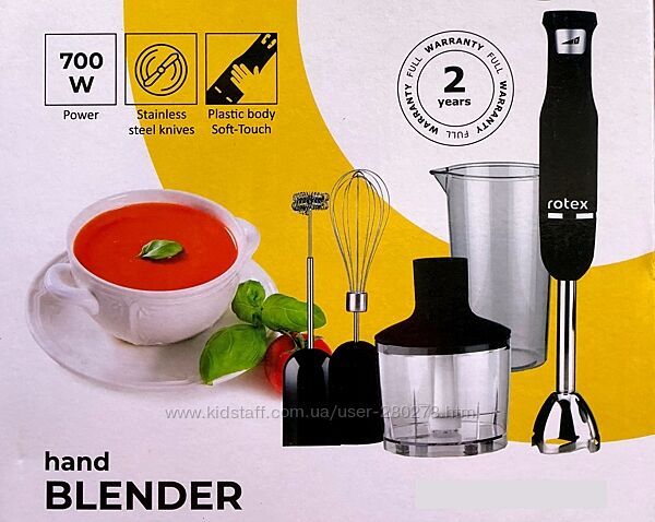 Блендер погружной с металлической ножкой в наборе 4в1Погружной блендер - исполнен в стильном корпусе из прочного пластика и ножки из нержавеющей стали .