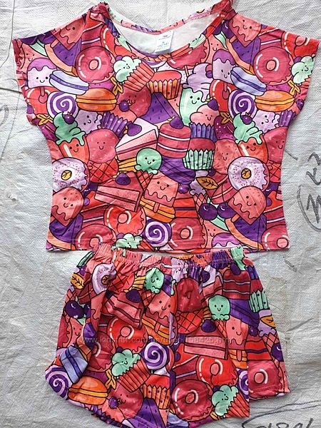 Трикотажной пижама состоит из футболки и шорт с глубокой посадкой