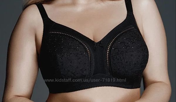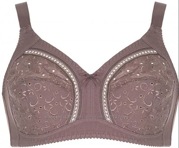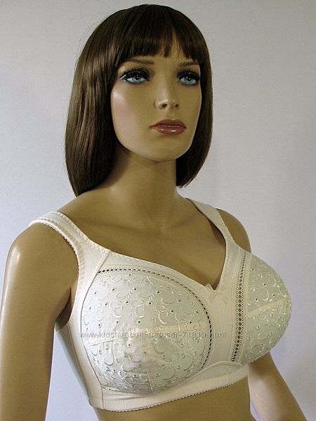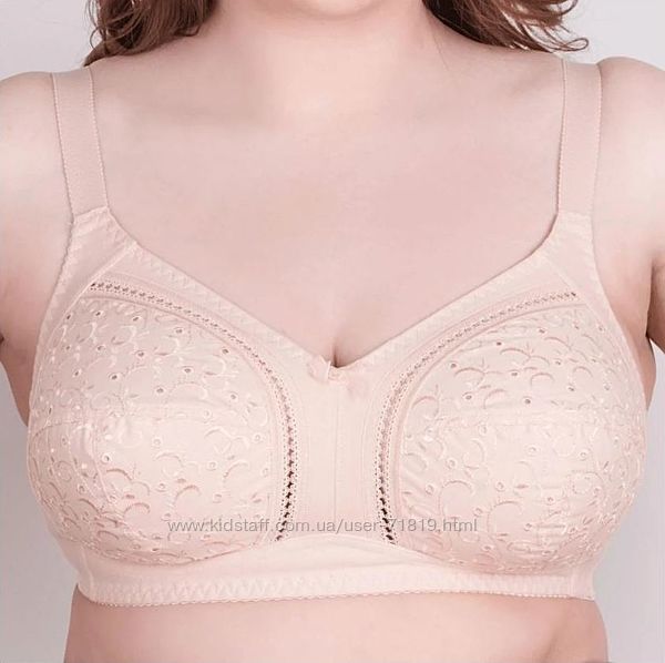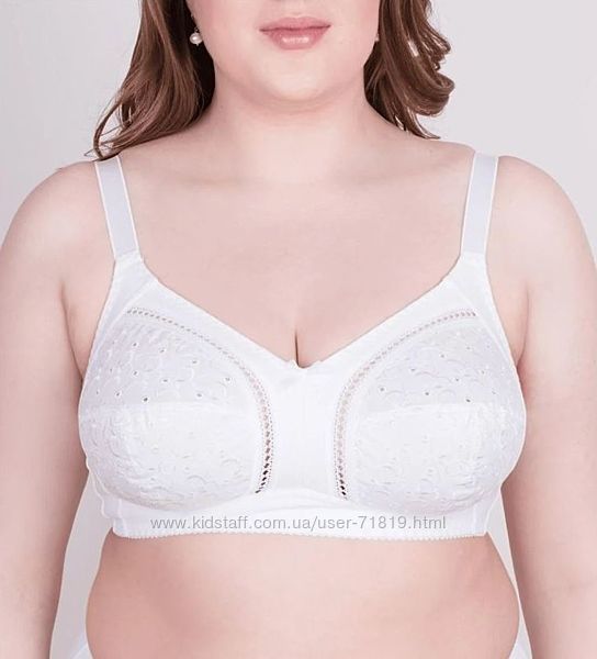 Бюстгальтер из вышитого тканного хлопкового полотна и эластичного трикотажного полотна с содержанием хлопка. Без каркасов. Упругие пластины в боковых деталях стана. Расширенная бретель. Мягкие чашки с тройным Т-образным членением и боковой корректирующей деталью. Нижние детали чашек на подкладке из тканного хлопкового полотна. Центральная деталь бюстгальтера и боковые детали чашек ламинированы тканным хлопковым полотном. Отделка - шитьё на тканном хлопковом полотне и бантик. Расширенное размерное предложение. Бюстгальтеры большого размера!Наличие размеров и цветов уточняйте.