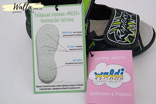 Внешняя поверхность обуви и подкладки изготовлена из натуральных «дышащих» тканей. Легкая подошва из ПВХ не оставляет следов на полу. Стелька ортопедическо-профилактическая с супинатором. Модель, дизайн создан конструкторами, технологами, докторами-ортопедами. Все больше мам отдают предпочтения именно тапочкам «WALDI». Отличный вариант для садика, дома или прогулок летом на свежем воздухе. Задник жестковатый. Стелька входит в комплект тапочек, вклеена.