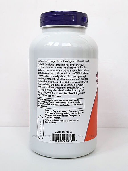 Соняшниковий лецитин Now Foods містить фосфатидилхолін, найпоширеніший фосфоліпід у клітинній мембрані, де він відіграє ключову роль у клітинній сигналізації та синаптичній функції. Соняшниковий лецитин Now Foods також природно рясніє фосфатидилінозитом, фосфатидилетаноламіном і незамінними жирними кислотами. Лецитин у раціоні допомагає емульгувати жири, дозволяючи їм диспергуватись у воді; його холін легко засвоюється і використовується організмом.