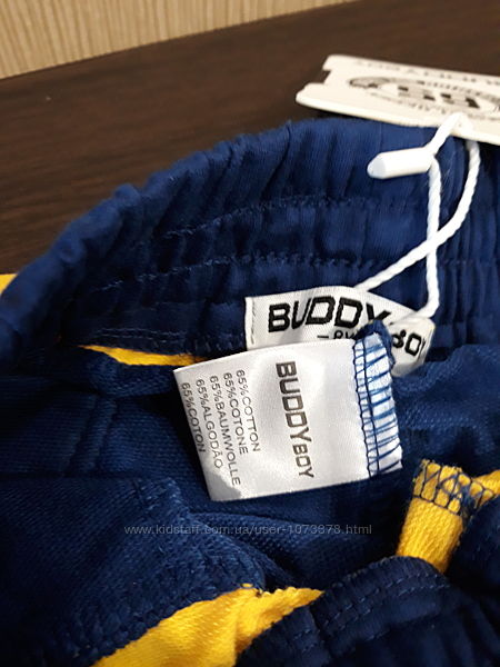 Фабричный венгерский производитель "Buddy boy". Шорты трикотажные двухнитка красивого синего цвета. С яркими контрастными полосками. Спереди два внутренних кармана и яркая надпись на обеих штанинах. Задний кармашек также функциональный. Изделие легкое, качественное, прекрасно подходит для лета.Смотрите замеры, пожалуйста