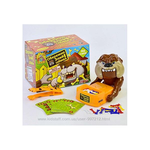 Описание: Игровой набор "Собака-кусака", упаковка - картонная коробка. Набор включает: фигурку собаки, миску, пинцет, 20 игровіх карточек, 24 разноцветные косточки, правила игры. Ход игры: после того, как собака "заснет", в ее миску насыпаются кости, а карточки выкладываются в одну стопку лицом вниз. Игроки тянут по 1 карточке, на которой изображено, сколько костей и какого цвета необходимо забрать из миски. Косточки берутся при помощи пинцета. Игрок, на чьем ходе пес проснулся, выбывает из игры. Набор оснащен музыкальными эффектами. Питание - 3 батарейки типа АА (нет в комплекте).