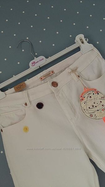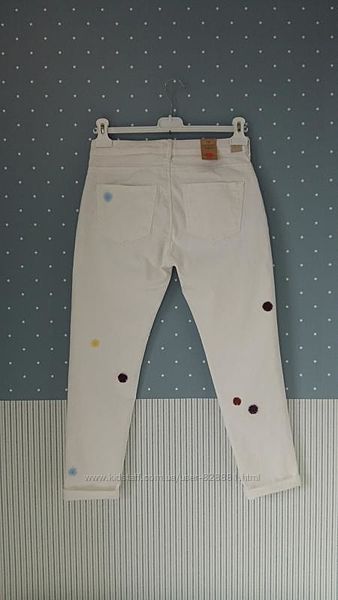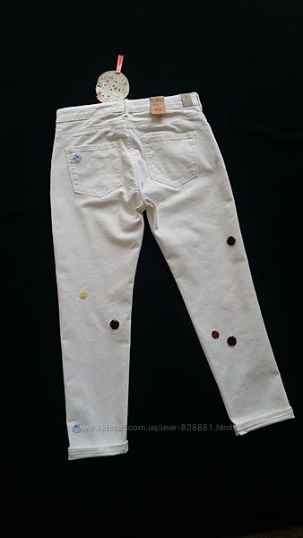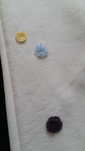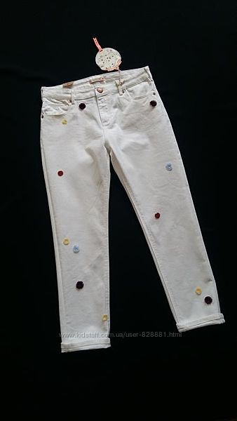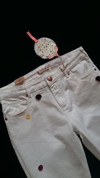 Классные джинсы-бойфренды молочно-белого цвета, декорированные разноцветными мини-помпончиками.Талия регулируется утяжкой.