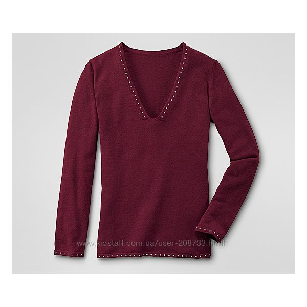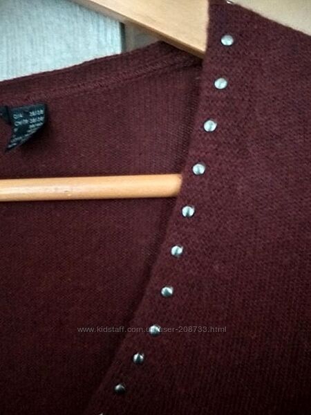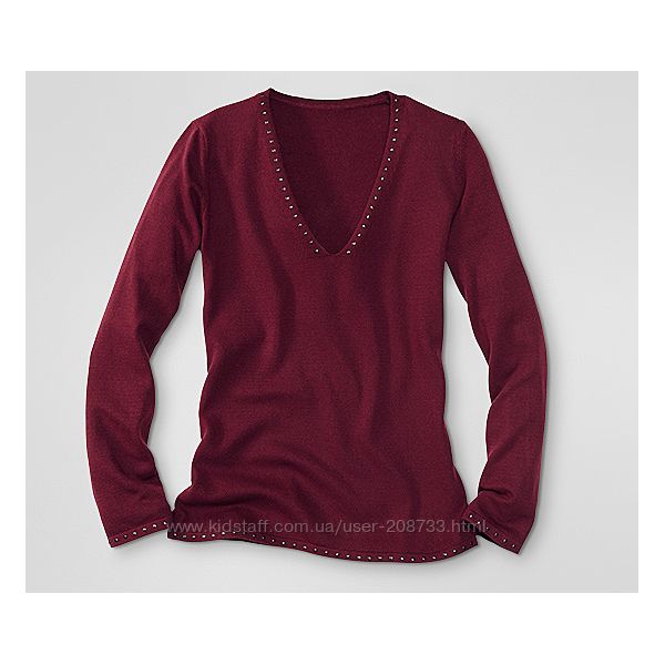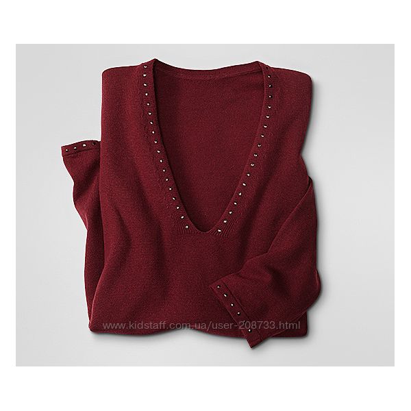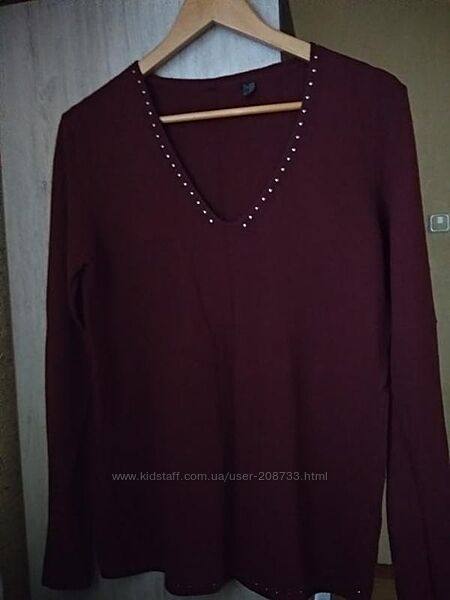 Мягкая вискозная смесь с 5% содержанием кашемира. Декольте, рукава и нижний край украшены заклепками. Слегка закругленный нижний край. Стандартный крой, ткань хорошо тянется.