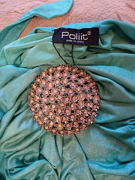 Новое нарядное платье, размер S. Очень красиво переливается ткань и брошь, завязывается тесемками за шеей. Плечи открыты, по бокам присобрано за счёт резинки.Платье абсолютно новое.