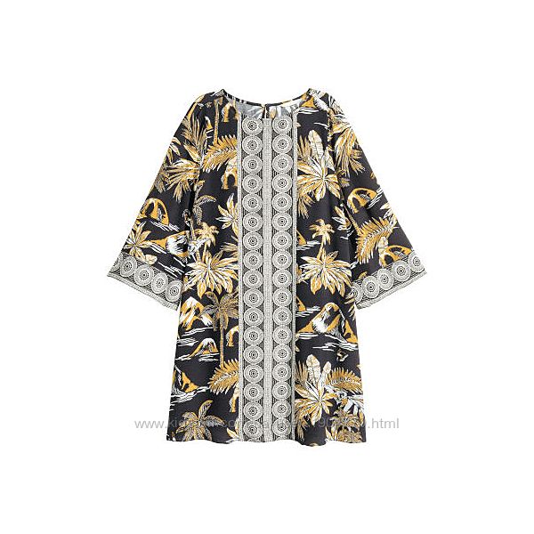 Короткое платье-трапеция из вискозной ткани с набивным рисунком. Рукав-колокол длиной три четверти. На вороте сзади разрез с застежкой на перламутровую пуговицу. Подкладки нет. Легкое и приятное на теле.Состав: Вискоза 100%.