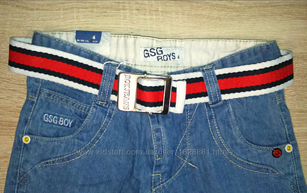 Бриджи джинсовые фирмы GSG Boys. Состав: 95% хлопка и 5-полиэстер. Страна производитель Китай. Размер 4 года (98-104 см): В наличии 2 пары: длина по боковому шву 41 см, шаговый шов 21 см, ширина по талии 31 см, ширина по линии бедер 39 см, посадка переда 18 см и по попе 24 см, ширина штанины вверху ножки 21 см и внизу 18 см.Размер 14 лет (158-164 см): длина по боковому шву 56 см, шаговый шов 35 см, ширина по талии 39 см, ширина по линии бедер 49 см, посадка переда 20 см и по попе 28 см, ширина штанины вверху ножки 26,5 см и внизу 22,5 см.