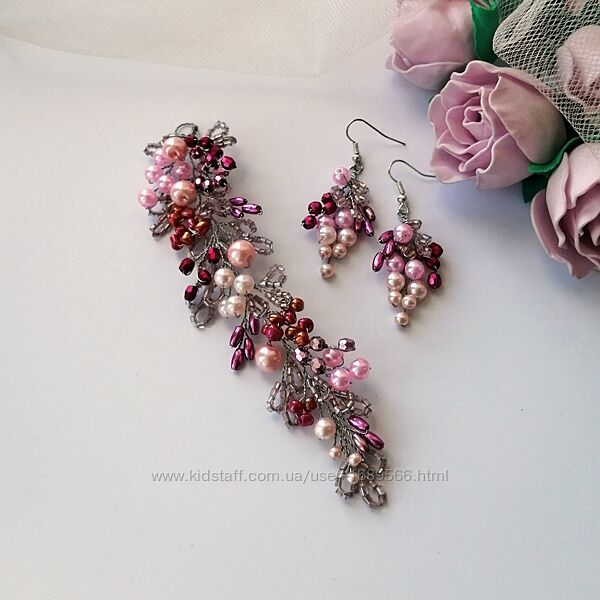 Ніжна колірна гамма, прикраса виглядає розкішно і елегантно одночасно. Гілочка кріпиться до зачіски шпильками або невидимками. Рожева весільна гілочка для зачіски буде чудово виглядати в будь-якій зачісці, буде триматися на короткому або тонкому волоссі. Прикраса гнучка і може приймати будь-яку необхідну вам форму. Довжина 13 см. Сережки у такому самому стилі. Довжина сережок 3,5 см.