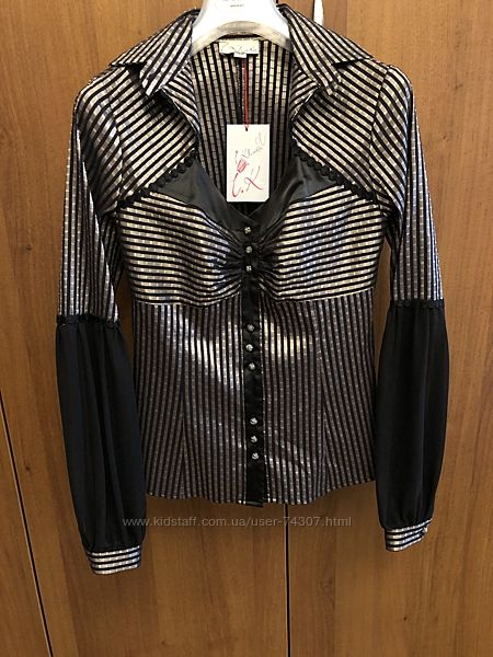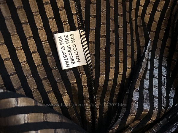Новые элегантные золотистые блузки тм I. Klairie почти одинакового размера. Европейский размер одной 36, другой 38, но отличаются очень мало, обе на наш 44. Цена по 200 грн.1. Нарядная блузка с шифоновыми рукавами. Эффектное сочетание розового золота и чёрной полоски, шифон, атлас, маленькие металлические пуговки. Приталенный крой. Натуральный состав ткани с добавлением эластена для хорошей посадки на фигуре. Крой рукава, сочетание полупрозрачной текстуры, рюши и фигурный вырез в тренде сезона. Размер европейский 36, на наш 44. Замеры: ПОГ 44-45 см, ПОТ 38 см, длина 57 см, плечо 12 см + длина рукава 65-66 см (шифоновая часть рукава должна идти с напуском).