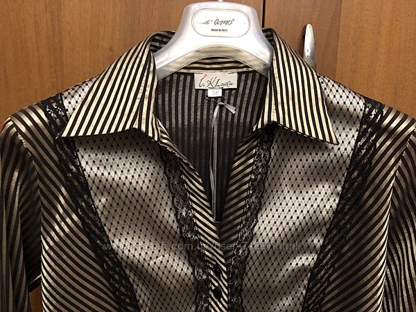 2. Элегантная золотистая блузка с кружевом. Эффектное сочетание двух видов полоски, кружева и маленьких пуговок. Приталенный крой. Размер европейский 38, на наш 44. Замеры: ПОГ 45-46 см, ПОТ 38 см, длина 56,5 см, плечо 12 см + длина рукава 62 см.