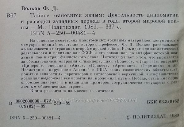 Ф.Д.Волков. Тайное становится явным. Деятельность дипломатии и разведки западных держав в годы второй мировой войны. Москва, Издательство политической литературы, 1989 г., 367 стр., твёрдая обложка, состояние удовлетворительное. Цена – 200 грн.Книга находится в Одессе, в центре города. Самовывоз, оплата наличными по месту.