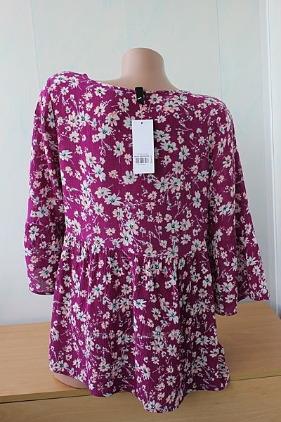 ткань -вискоза, НЕ ТРИКОТАЖ. замеры не растягивая ( а я бы так и носила, не разглаживая складочки), талия не тянется. На лето - отлично, не мнется. сядет и на 16 размерпог- 54, пот- 51, поб- 67, длина- 66 см.