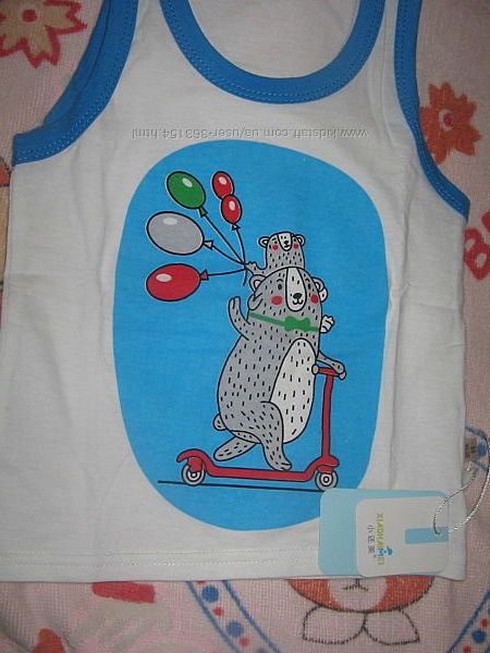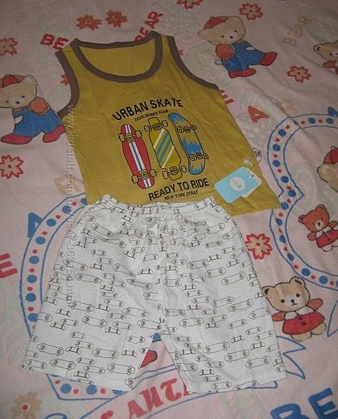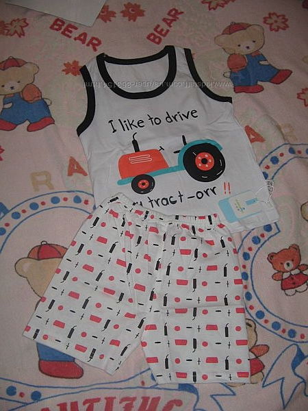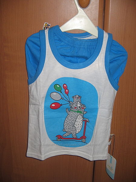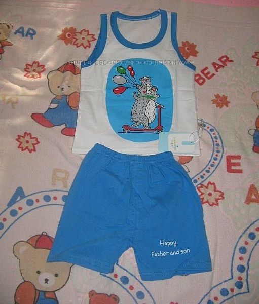 Комплекты из майки и шорт состав 100% коттон, хорошее качество. Майка тонкая, мягкая и приятная к телу. Шорты тоже легкие и приятные, пояс на мягкой резинке, без карманов. Можно использовать, как пижамку. Производство Китай.белая майка с большим принтом и насыщенные голубые (светло-синие)шорты , р.55 идет на 9-12 мес рост 74-86 см цена 150грн