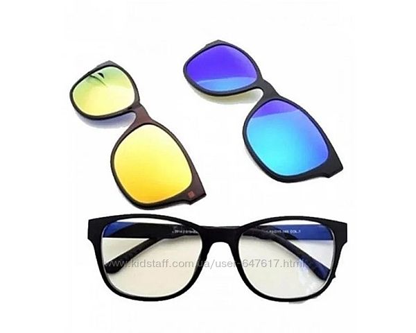 В комплект к очкам Magic Vision с прозрачными линзами, входят дополнительные линзы желтого, зеркального, черного и синего цвета, которые крепятся на очки при помощи магнита.