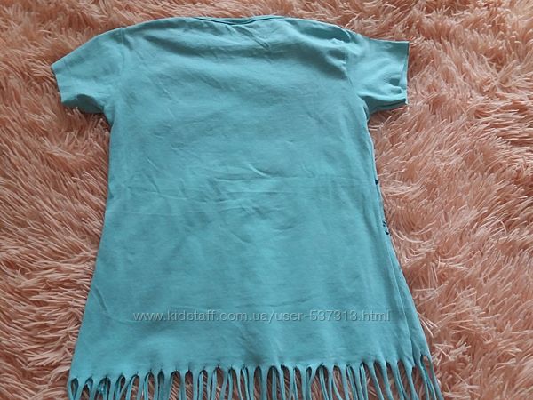 Мятная футболочка с бабочкой в пайтках. Длина 42см, с бахромой 48см. ПОГ -32см, плечики - 27см. Указан размер 140, реально на 116. Турция. Цена 10 грн, пайетки синего цвета идеальны, а вторая розовая сторона местами чуть потеряла цвет на серебро.