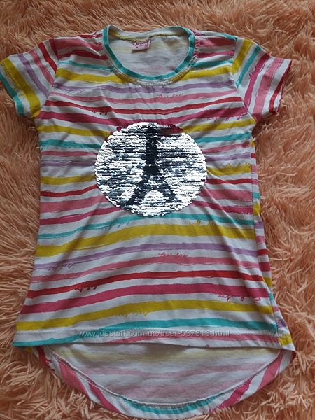 Футболка-туника разноцветная с эйфелевой башней пайетки переменяшки. ПОГ -31см, длина 46см по передней части, 54 - по спинке, плечики - 28см. Указан размер 7-8, 128 рост, можно на 116-122. Состав смешанный. Цена 10 грн.