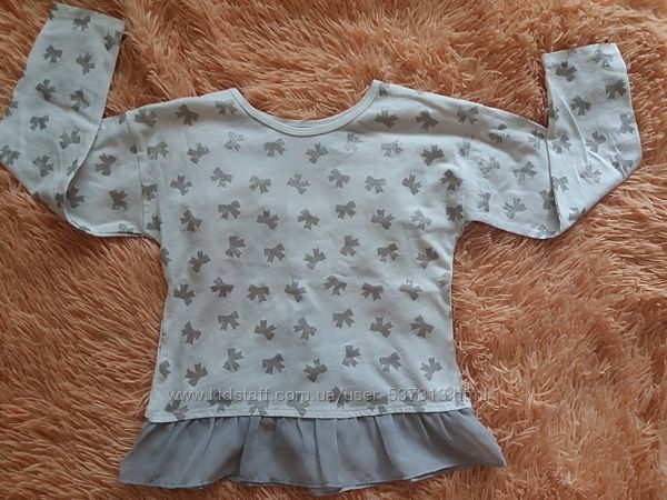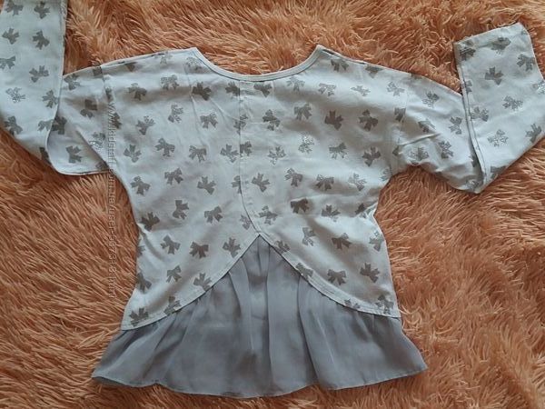 Легкая натуральная кофточка с длинным рукавчиком и вставкой из шифона на спинке. Длина 40см, от горловинки рукавчик вместе с плечиком - 47см, ПОГ - 36см, ПОТ - 32см, очень нежно смотрится. Летними вечерами отлично спасает от жары и комариков). Америка, указан размер 5Т, на рост 110 -116. Цена 20 грн.