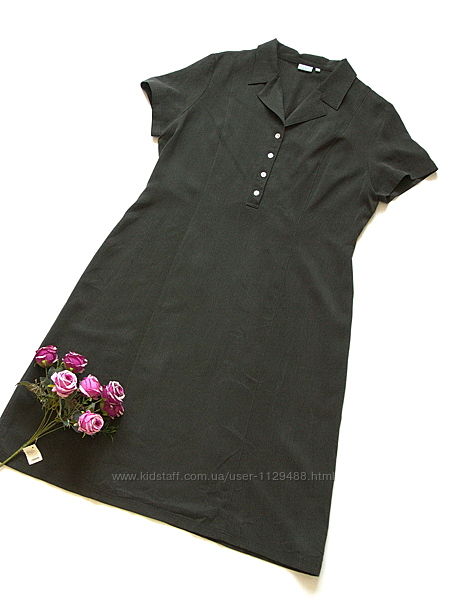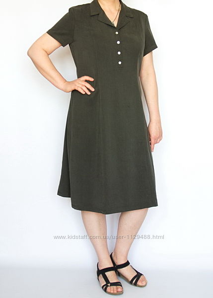 Актуальной модели, вне времени и моды, изготовлено из натуральной дышащей тяжелой струящейся ткани, очень приятной и нежной. Крой чуть приталенный, длина миди, цвет благородный приглушенный зеленый , ворот отложной английский, застежка планка с пуговками из натурального перламутра.