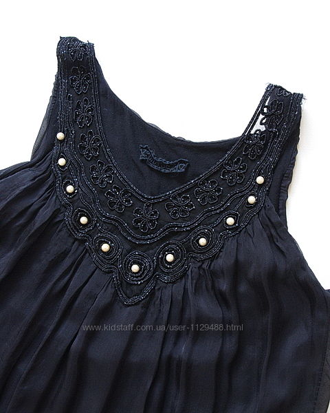 Платье двухслойное, темно-синего цвета, нижний слой из мягкого эластичного дышащего трикотажа, по низу оборка из натурального шелка, верхний слой свободный, из натурального шелка, горловина декорирована богатой вышивкой тонким шнуром по сетке и жемчужными бусинами. Вещичка просто завораживает и притягивает взгляд. В носке очень комфортно, не жарко и не сковывает движений, самодостаточное, не нуждается ни в каких дополнительных украшениях. Все при нем и сразу!)