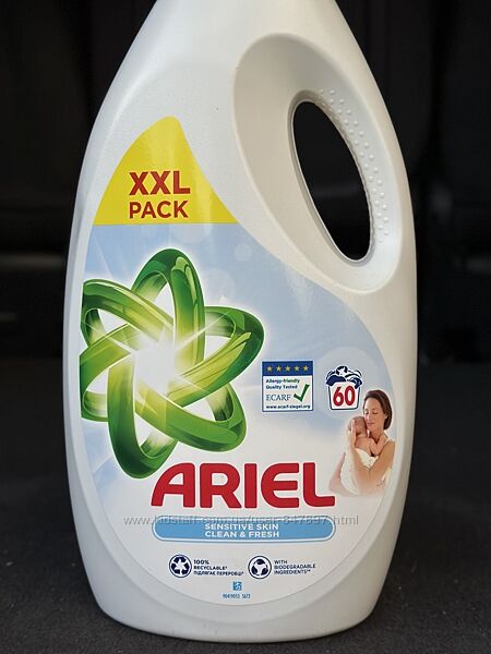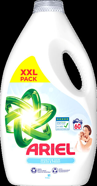 Глибока чистота білизни навіть з чутливою шкірою? З рідким гелем для прання Ariel Sensitive це просто. Ніжна композиція без барвників і зі зниженим вмістом алергенів безкомпромісна до плям і, крім того, 80% інгредієнтів біологічно розкладаються. Упаковка на 100% підлягає переробці. Дерматологічно протестовано та схвалено ECARF. Гель для вмивання Ariel Sensitive для ідеальної чистоти та додаткової м´якості для чутливої шкіри.