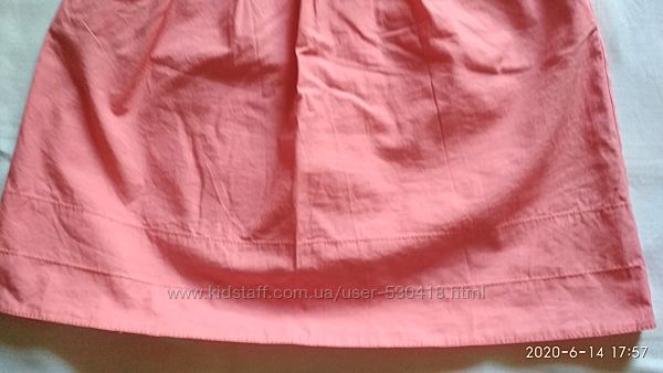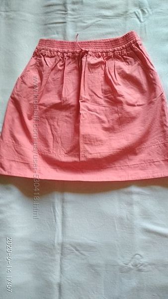 Тоненькая котоновая юбка на девочку ростом около 146см. 100% хлопок, впереди два кармана, талия на резинке и дополнительно стягивается кулиской, по низу декоративные строчки.Замеры: ПОТ- 27см плюс тянется резинка, длина- 38см. В отличном состоянии, без нюансов.