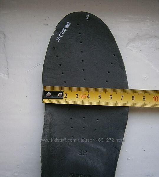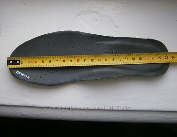 EU 36, US 5, UK 4 , CN 225 , довжина устілки від краю до краю 23.5 см ( включно з бортиком) , і ширина 7,6 см