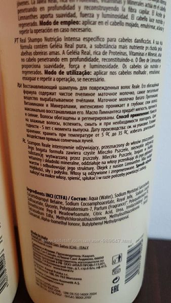 Восстанавливающий шампунь для поврежденных волос Reale. Его обогащённая формула содержит чистое пчелиное маточное молочко, самое питательное вещество вырабатываемое пчёлами. Маточное молочко богато Протеинами, Витаминами и Минералами, интенсивно проникает в глубокие слои волоса, максимально восстанавливая его. Масло Лимнантеса придаёт мягкость, прочность и сияние. Волосы обогащены и регенерированы.