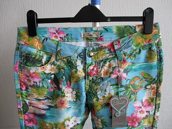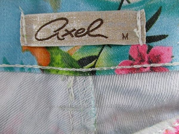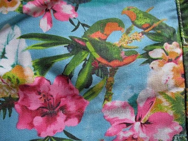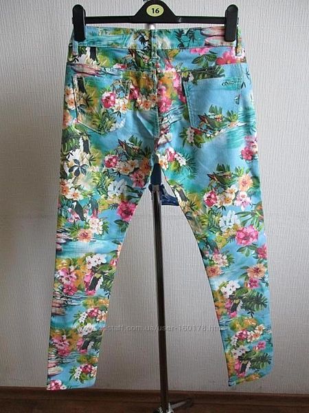 Джинсы в модный тропический принт axel accessories Новые с биркой Размер указан: M, подойдут на 44-46 укр.размер, но ориентируйтесь на замеры Сезон: весна-лето Замеры изделия (почти не тянутся): ПО талии – 41,5 см (тянутся до 42 см) ПО бедер - 48 см (тянутся до 49 см) Посадка спереди – 17 см Посадка сзади – 31 см Длина штанины по внутреннему шву (шаговый шов) - 80 см Длина штанины по внешнему шву (вместе с поясом) - 100 см Ширина штанины сверху - 27 см Ширина штанины в районе колена - 16 см Ширина штанины по низу – 15 см ....................................... Возврата и обмена нет! .........................................