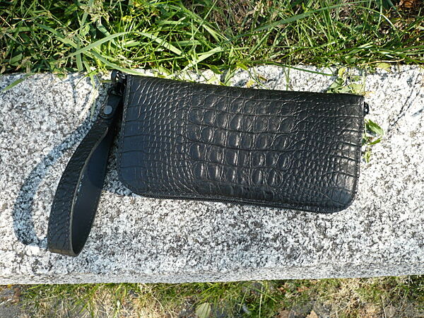 Кошелек зиппер. Выполнен из двух видов кожи черного или коричневого цвета. Внешняя часть: кожа КРС с тиснением под крокодила на лицевой поверхности ( Турция ); внутренняя часть: кожа КРС "crazy horse" (Украина). Молнии и собачки YKK ( Япония ) . Кошелек прошит вощеной нитью 0,35 мм. Размер: 210*110 мм. Функциональность: 4 отделения для купюр, 12 карманов для пластиковых карт, отделение для мелочи. Ручная работа. Ценность: 1700 грн.