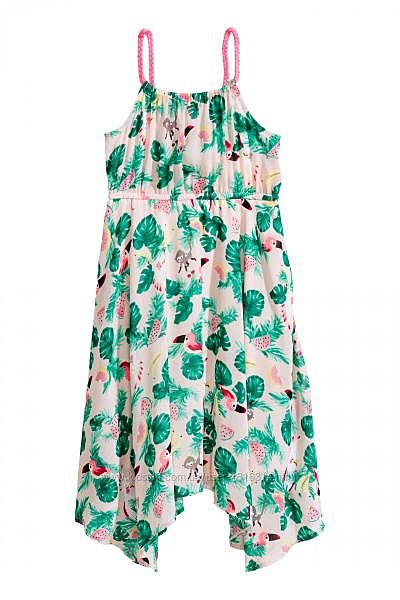 Тканое платье с набивным рисунком; узкая резинка сверху; плетеные брители; отрезная талия с юбкой асимметричного кроя; на подкладке.