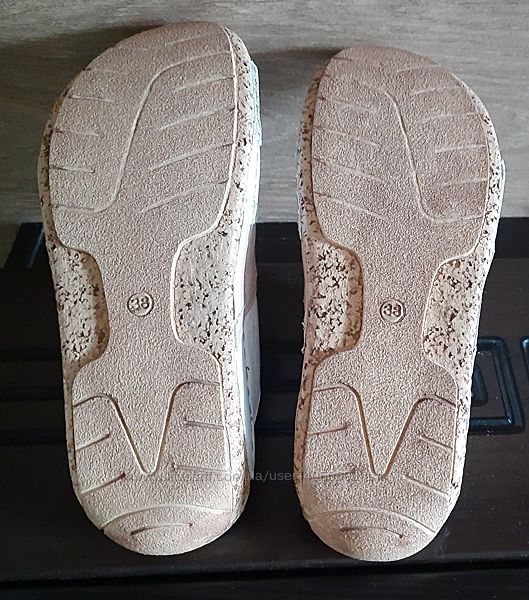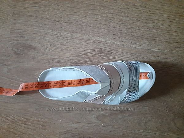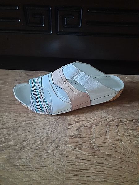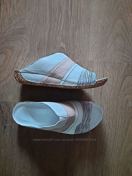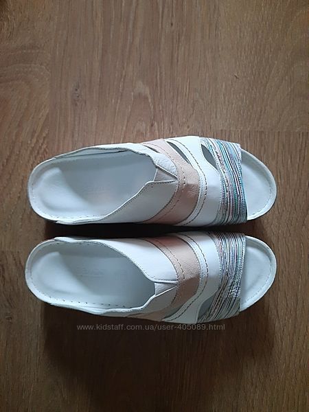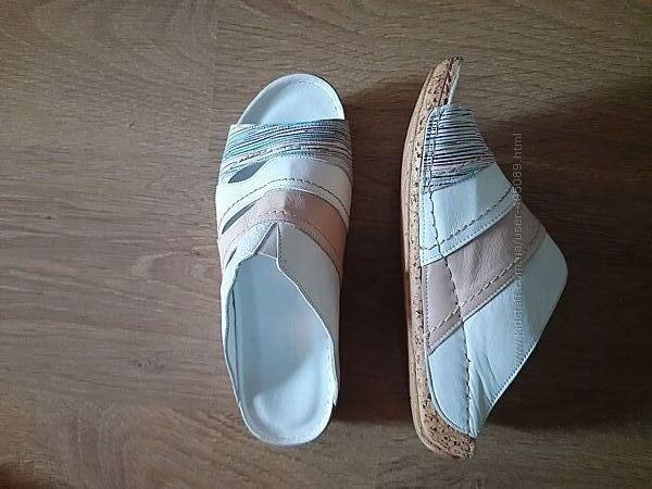 Новые . Шлепанцы известного европейского бренда из мягкой, натуральной кожи. Кожа как сверху, так и внутри. Произведство Германии. размер - 38, длина стельки -25 см ширина стельки в самом широком месте- 8.5см. Не для худой ноги. Высота танкетки 1.5см, в области пятки - 3 см. Без возврата.