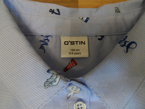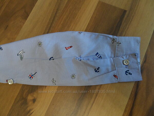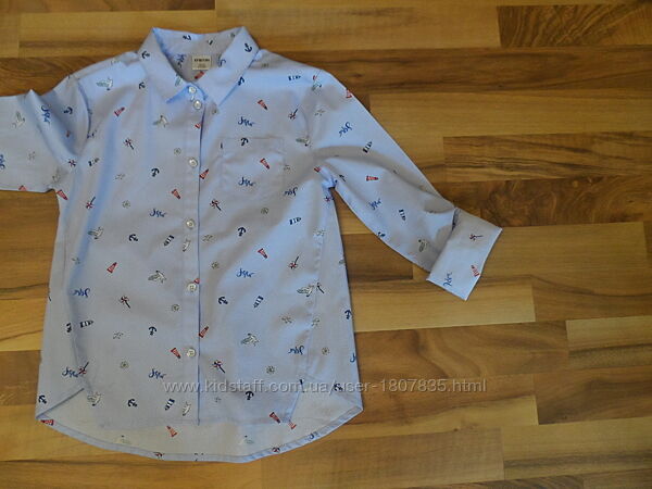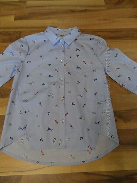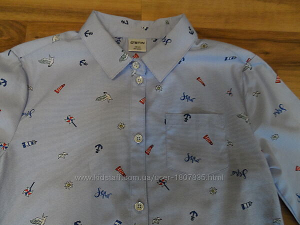 Продам Рубашка OSTIN, р 8-9 лет. Куплена в фирменном магазине в Киеве. Но весну просидели дома, поэтому абсолютно новая провисела в шкафу. Бирки срезали. Цвет голубой в полоску с рисунками морскими: якоря, маяки, чайки. Модель по груди расклешонная. Впереди есть накладной карман. Рукав можно подкатить и сделать покороче с помощью клапана и пуговицы- видно на последнем фото.Замеры: