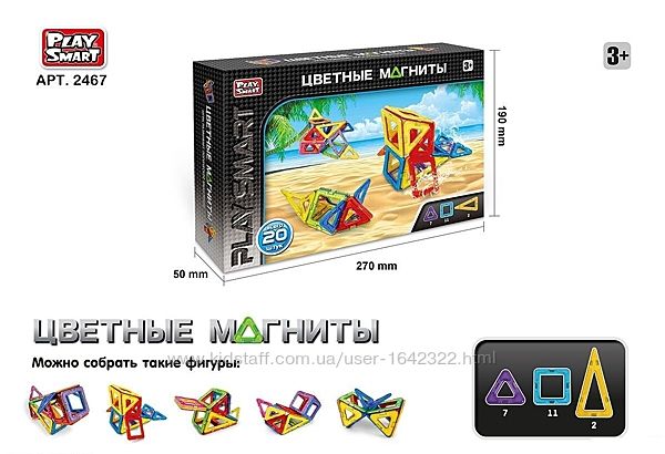 Характеристики ОсновныеПроизводитель Play SmartСтрана производительКитайТип конструктораМагнитныйПолУнисексВозрастная группаОт 3 летКоличество деталей20 шт.МатериалПластикЦвет Разные цветаСостояниеНовоеУпаковкаУпаковкаКартонная коробкаДлина упаковки270.0 (мм)Ширина упаковки190.0 (мм)Высота упаковки50.0 (мм)