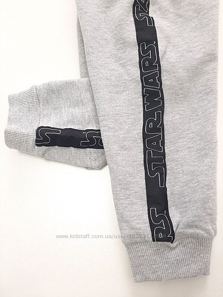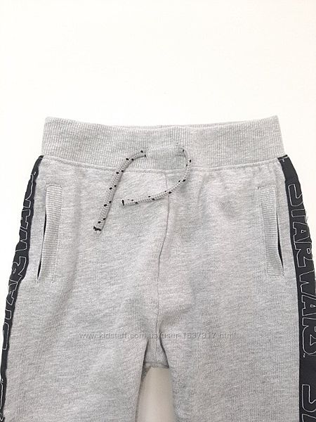 Штани на байці сірого кольору, збоку чорна нашивка Star wars, кишені обманки , пояс еластичний широкий, низ манжети. Склад: 93 бавовна, 7 поліестер.Заміри: довжина 50, посадка 23, крок 31, пояс 25+ 35 см.