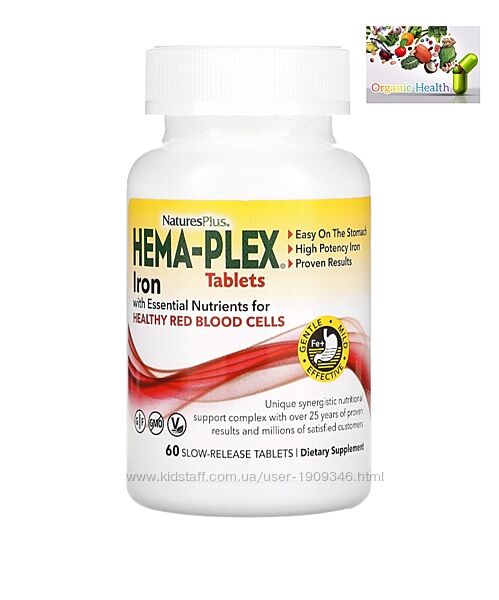 ***NaturesPlus, Hema-Plex, железо с незаменимыми питательными веществами для здоровых эритроцитов, 60 таблеток с медленным высвобождением- стоимость 800 грн